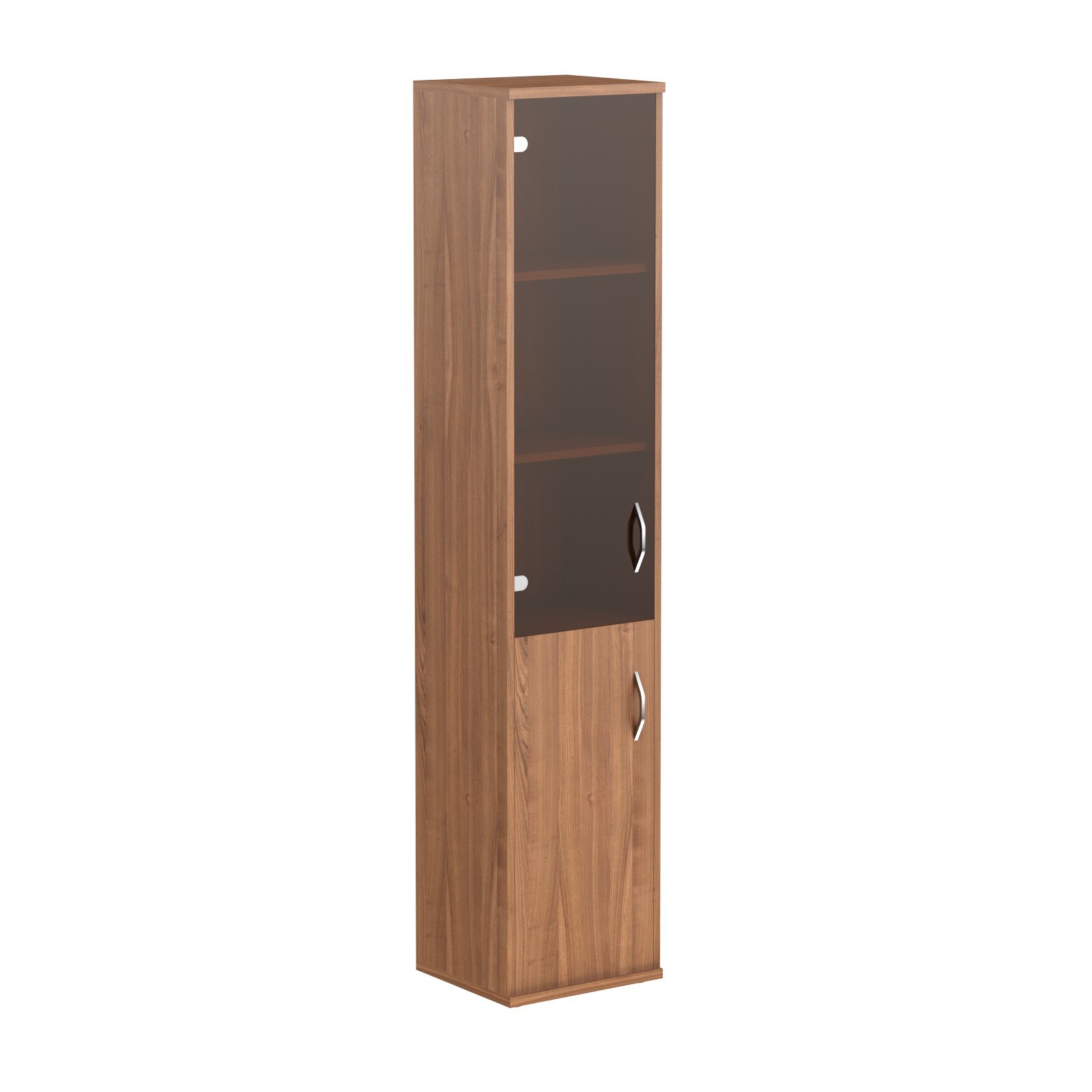 Универсальный шкаф комбинированый левый IMAGO для офисного или домашнего использования. Размеры - 406х1975х365 мм. Оснащен 5 полками, две нижние полки закрыты дверцей из ЛДСП, три верхние - стекляной дверцей со стильной тонировкой в цвет бронзы. Шкаф оснащен регулируемыми опорами для компенсации неровностей пола.