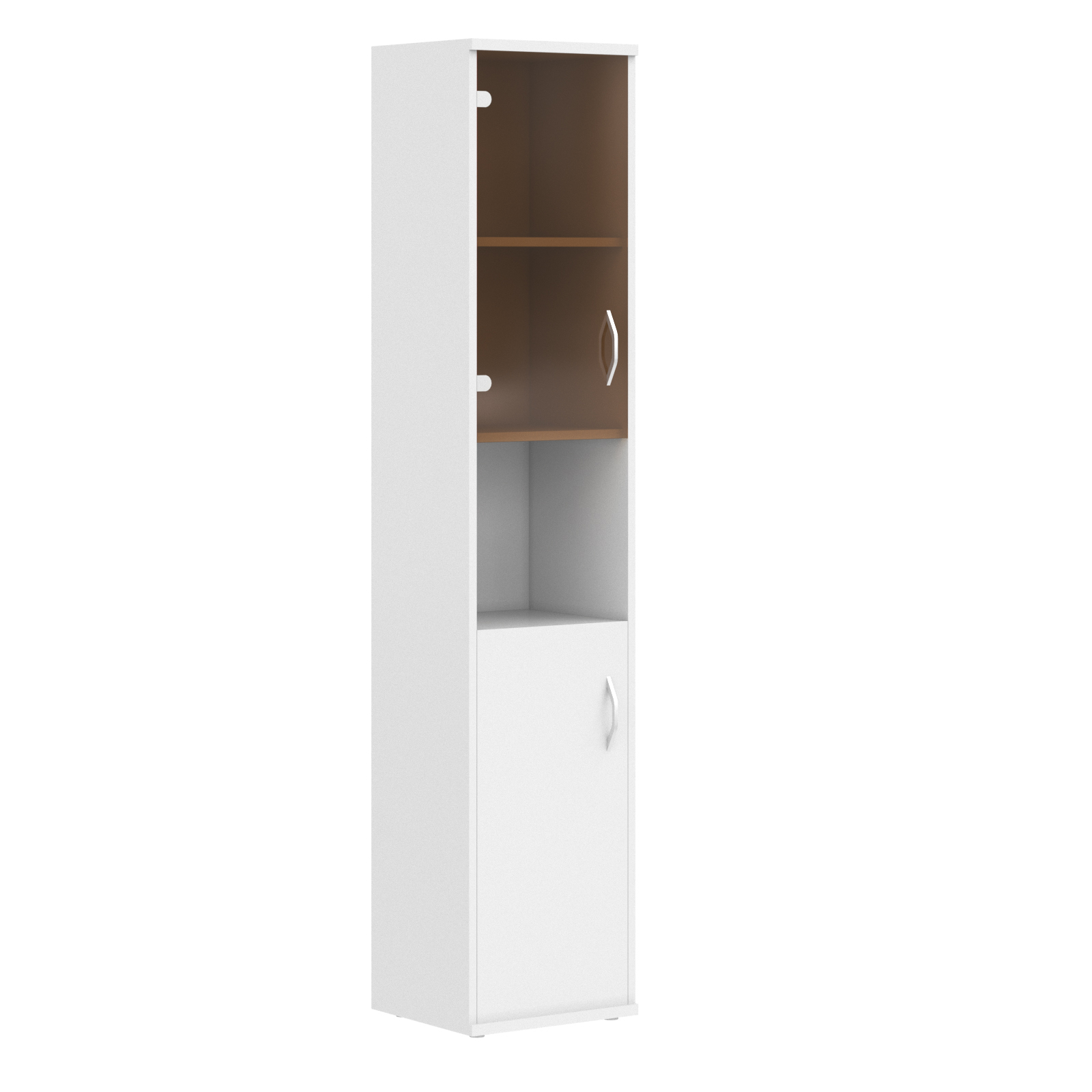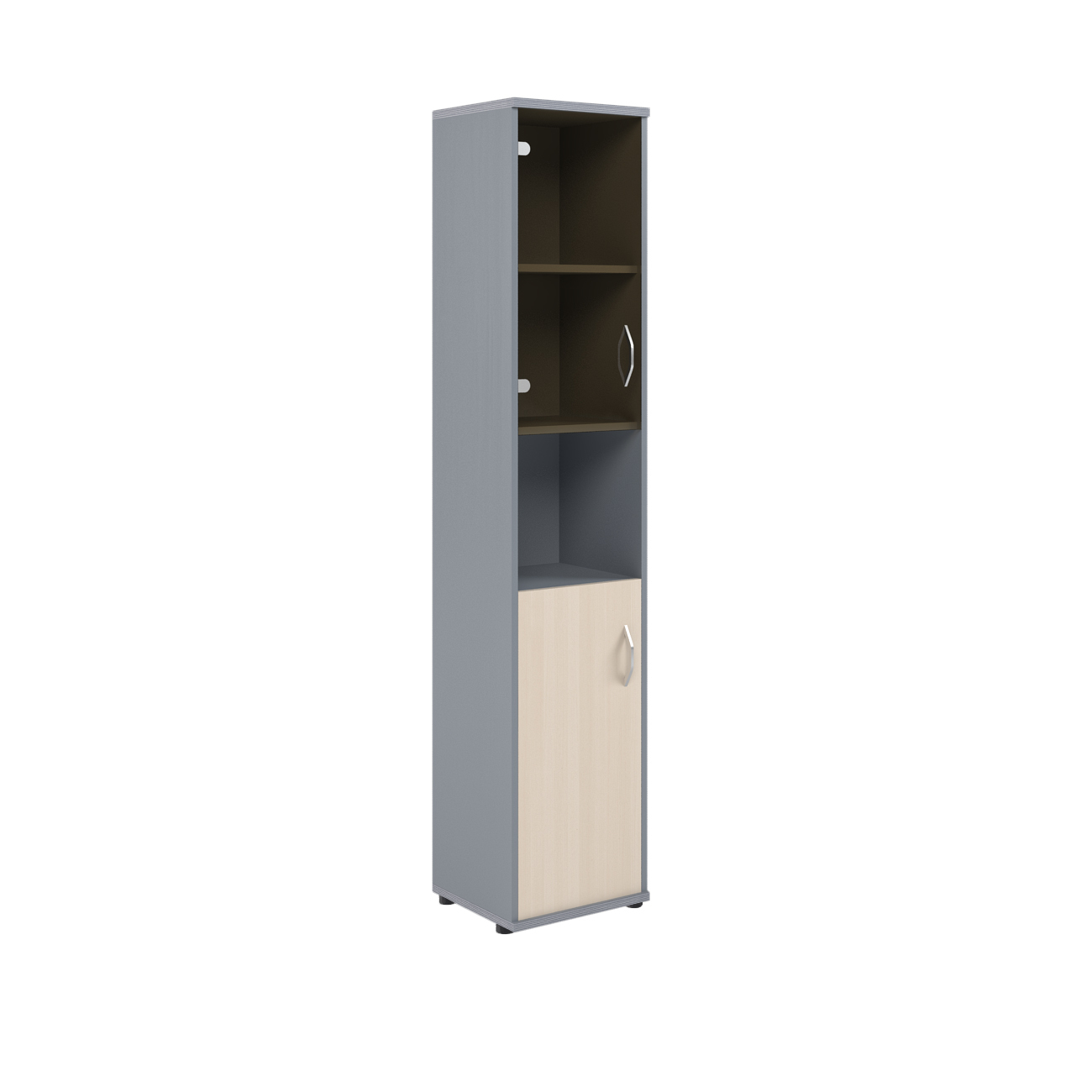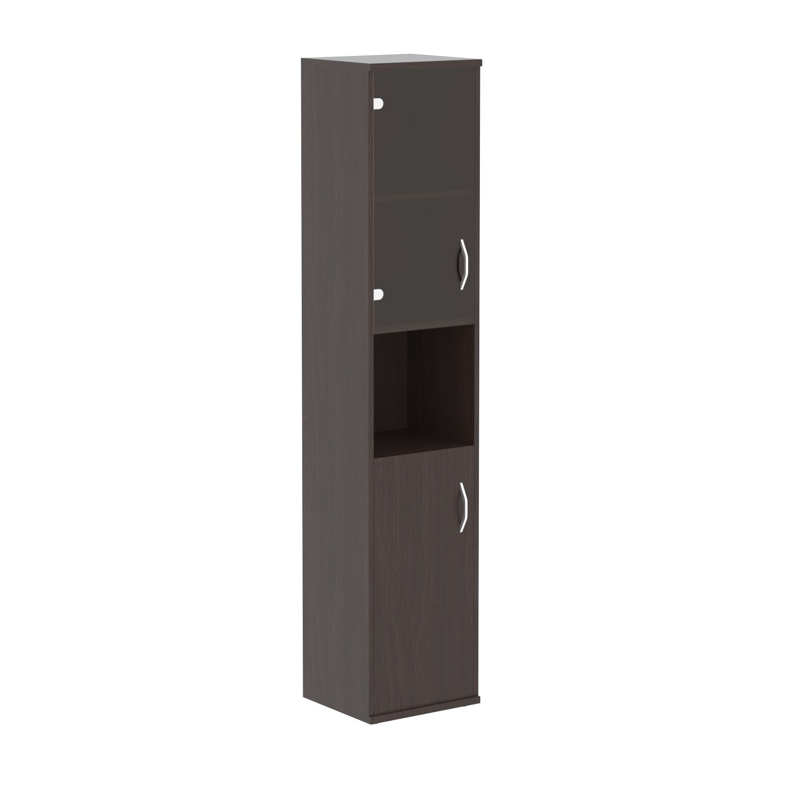 Компактный комбинированный шкаф IMAGO для офисного или домашнего использования. Размеры - 406х1975х365 мм, тип – левосторонний. Оснащен 5 полками, две нижние полки закрыты дверцей из ЛДСП, две верхние - стекляной дверцей со стильной тонировкой в цвет бронзы. Надежная защита торцевых поверхностей - кромка ПВХ 2 мм. Шкаф оснащен регулируемыми опорами для компенсации неровностей пола.