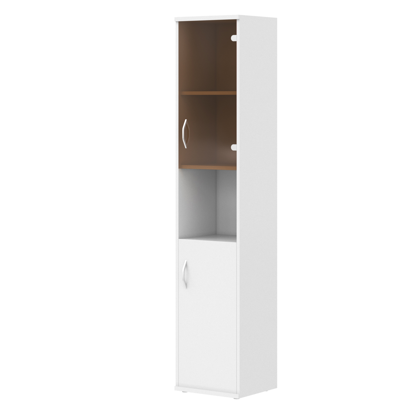 Универсальный шкаф комбинированый правый IMAGO для офисного или домашнего использования. Размеры - 406х1975х365 мм. Оснащен 5 полками, две нижние полки закрыты дверцей из ЛДСП, две верхние - стекляной дверцей со стильной тонировкой в цвет бронзы, средняя полка открытая. Шкаф оснащен регулируемыми опорами для компенсации неровностей пола.