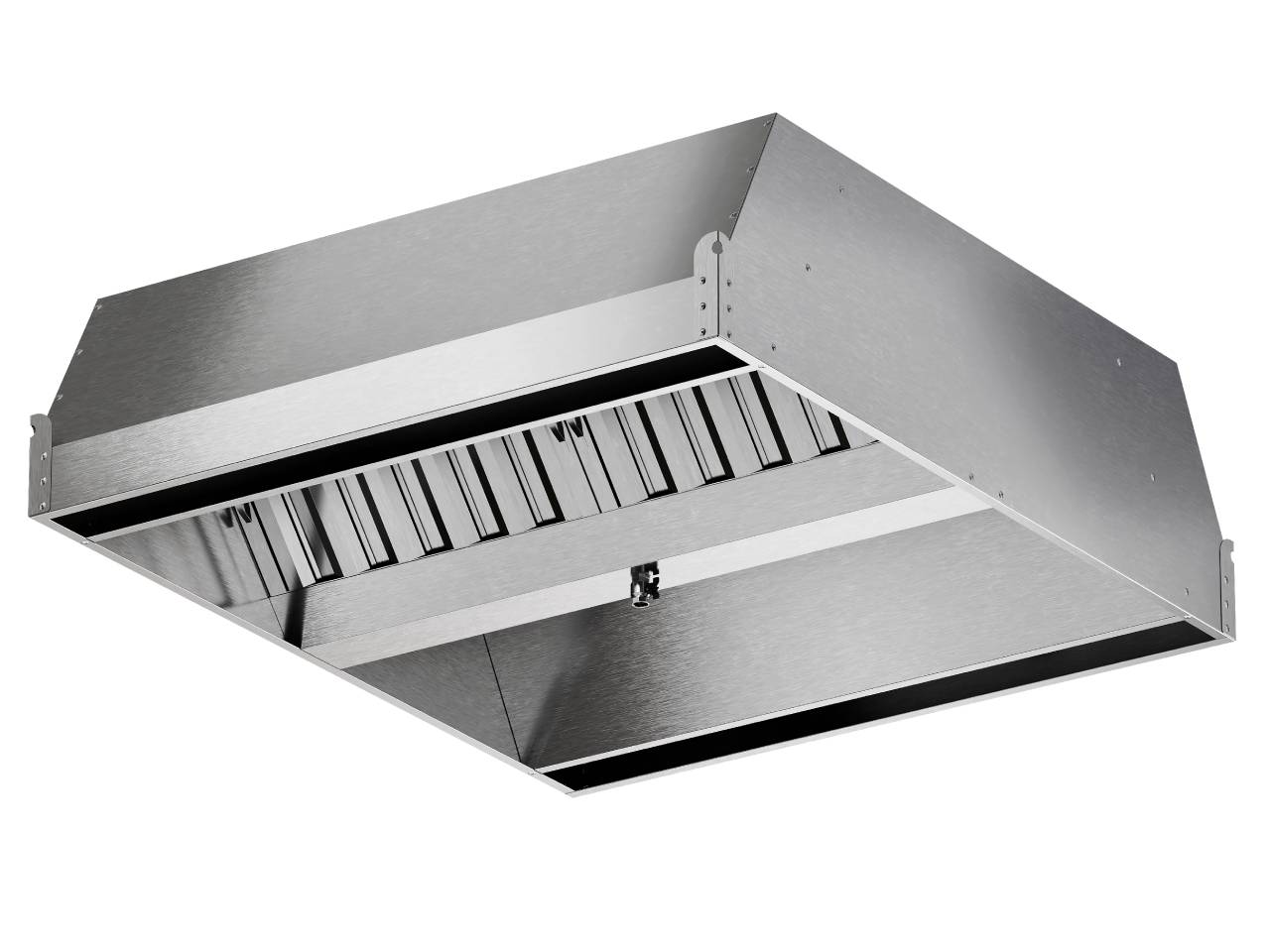 Приточно-вытяжной зонт изготовлен из высококачественной нержавеющей стали AISI430 толщиной 0,7 мм. Конструкция имеет две врезки для притока и оттока воздуха.